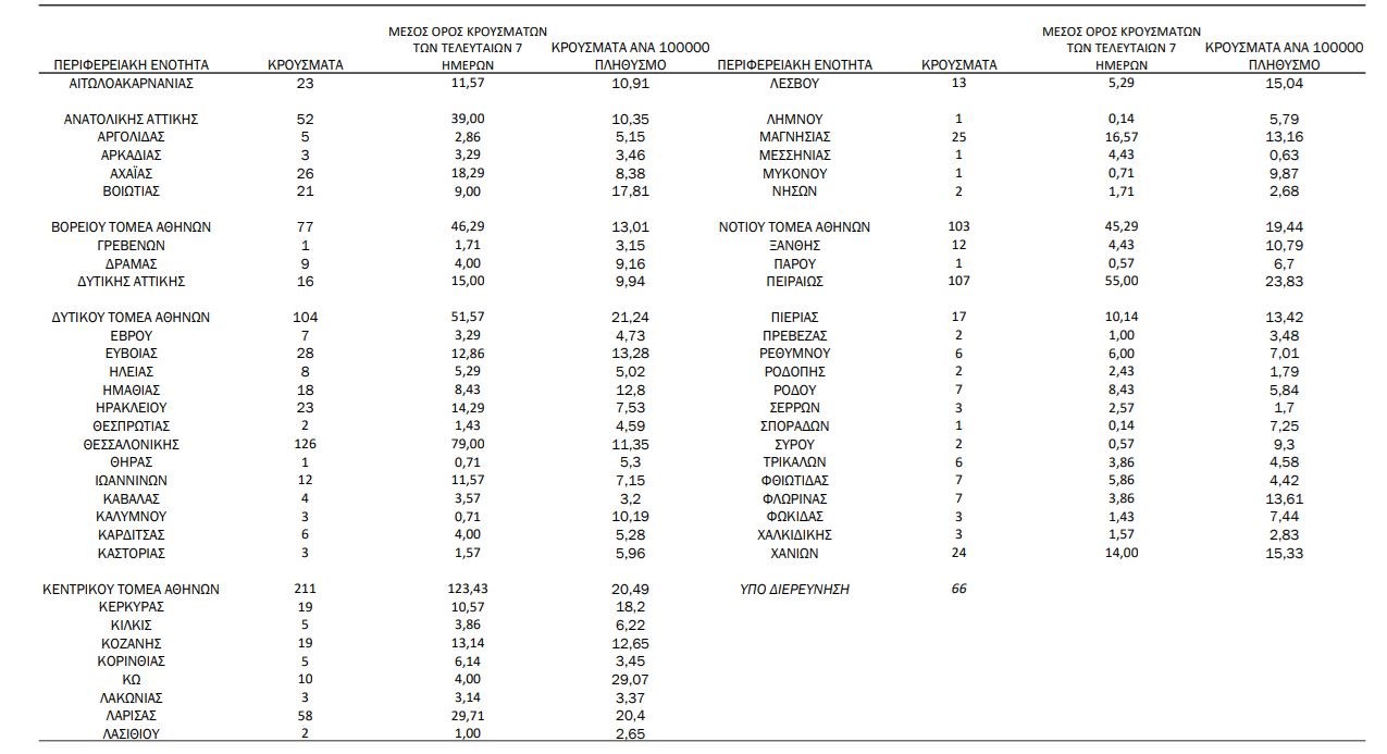 Στην Αττική το τελευταίο 24ωρο καταγράφηκαν 672 νέες μολύνσεις και ακολουθεί η Θεσσαλονίκη με 126. Στη Λάρισα εντοπίστηκαν 58 νέα κρούσματα, στην Εύβοια 28 και στη Μαγνησία 25.