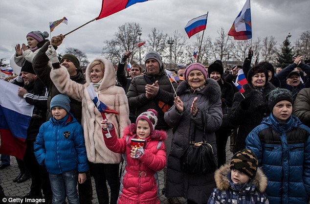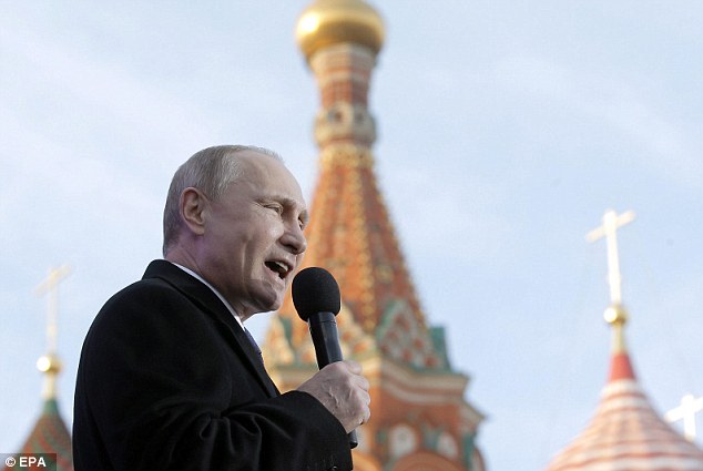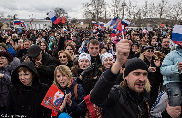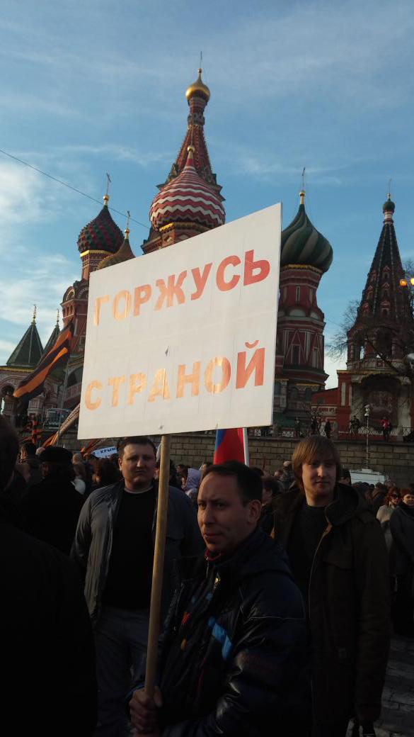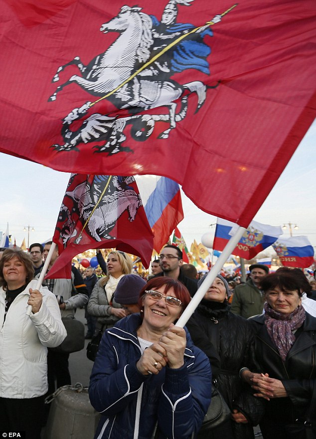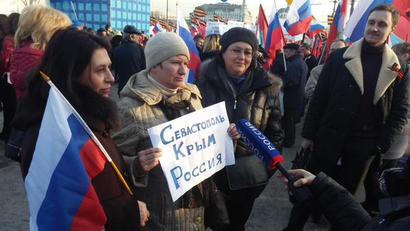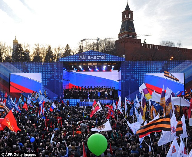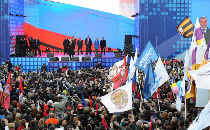 Ο Πούτιν απεθυνόμενος στους συγκεντρωμένους είπε ότι ο ρωσικός λαός έδειξε έναν «εκπληκτικό πατριωτισμό» στηρίζοντας την προσάρτηση της Κριμαίας, την οποία η Μόσχα τη θεωρεί ως μια «ιστορική επιστροφή».