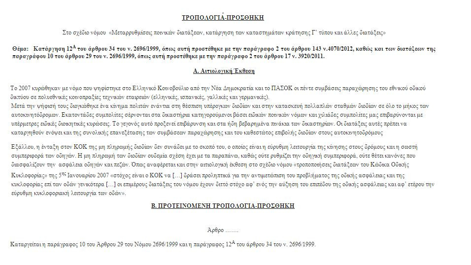 Δικαιώνοντας ουσιαστικά το κίνημα «δεν πληρώνω» που άνθισε στην αρχή της κρίσης, οι βουλευτές του κυβερνώντος κόμματος υποστηρίζουν: «Εκατοντάδες συμπολίτες μας σέρνονται στα δικαστήρια κατηγορούμενοι βάσει ειδικών ποινικών νόμων και χιλιάδες συμπολίτες μας επιβαρύνονται με υπέρμετρες ειδικές διοικητικές κυρώσεις. Το γεγονός αυτό προξενεί επιβάρυνση και στα ήδη βεβαρημένα πινάκια των δικαστηρίων. Οι διατάξεις αυτές πρέπει να καταργηθούν ενόψει και της συνολικής επανεξέτασης των συμβάσεων παραχώρησης και του καθεστώτος επιβολής διοδίων στους αυτοκινητοδρόμους».