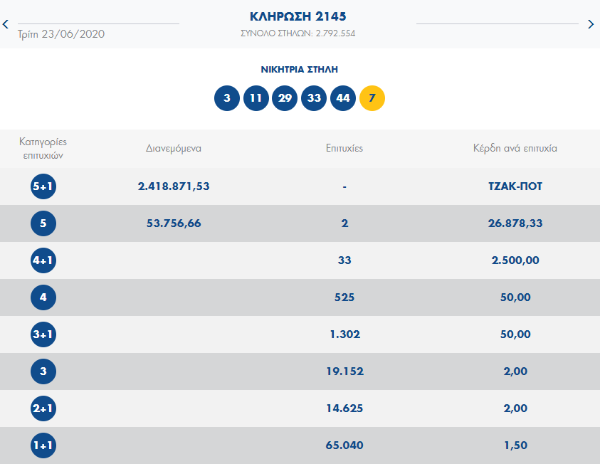 Οι αριθμοί που ανέδειξε η κληρωτίδα στην αποψινή κλήρωση είναι οι: 3, 11, 29, 33, 44 και τζόκερ ο αριθμό 7.