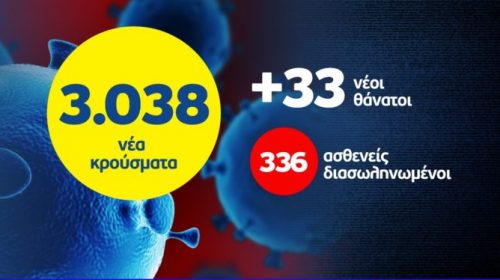 O ΕΟΔΥ ανακοίνωσε σήμερα ότι 3.038 νέα κρούσματα του και 38 θανάτους. Διασωληνωμένα είναι 336 άτομα. Τα 697 κρούσματα εντοπίστηκαν στην Αττική ενώ τα 725 στη Θεσσαλονίκη. Πάνω από 100 κρούσματα βρέθηκαν σε Μαγνησία, Λάρισα και Πέλλα.