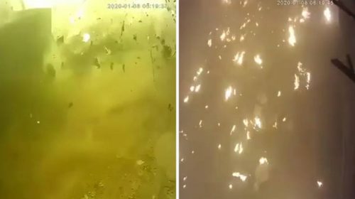Όπως βλέπετε, αχνοφαίνεται μία πύρινη λάμπα πριν γίνει η έκρηξη και εκτοξευτούν φλεγόμενα κομμάτια από το αεροπλάνο παντού. Λίγο αργότερα, φαίνονται φωτιές… κυριολεκτικά παντού.