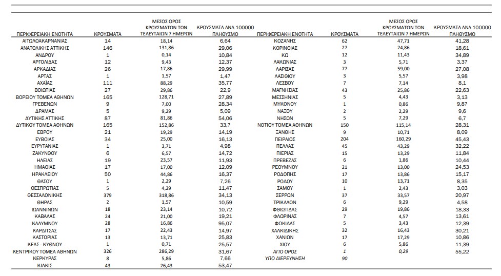 Τα νέα εργαστηριακά επιβεβαιωμένα κρούσματα της νόσου που καταγράφηκαν τις τελευταίες 24 ώρες είναι 2.747, εκ των οποίων 9 εντοπίστηκαν κατόπιν ελέγχων στις πύλες εισόδου της χώρας. Ο συνολικός αριθμός των κρουσμάτων ανέρχεται σε 290.964 (ημερήσια μεταβολή +1.0%), εκ των οποίων 51.4% άνδρες. 1 Με βάση τα επιβεβαιωμένα κρούσματα των τελευταίων 7 ημερών, 99 θεωρούνται σχετιζόμενα με ταξίδι από το εξωτερικό και 2.978 είναι σχετιζόμενα με ήδη γνωστό κρούσμα