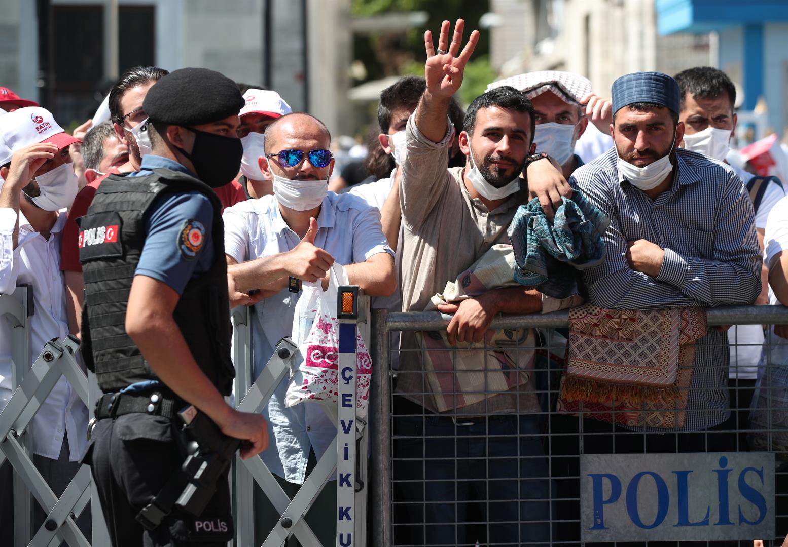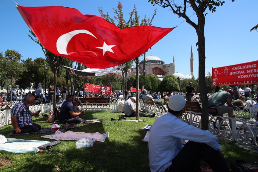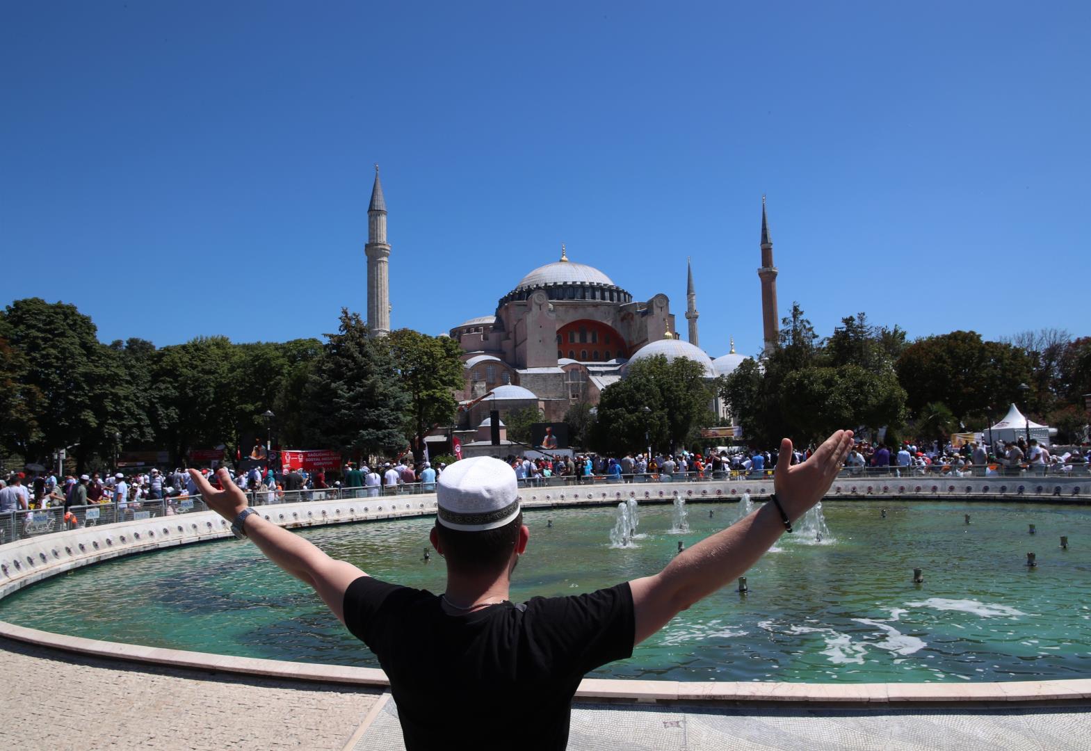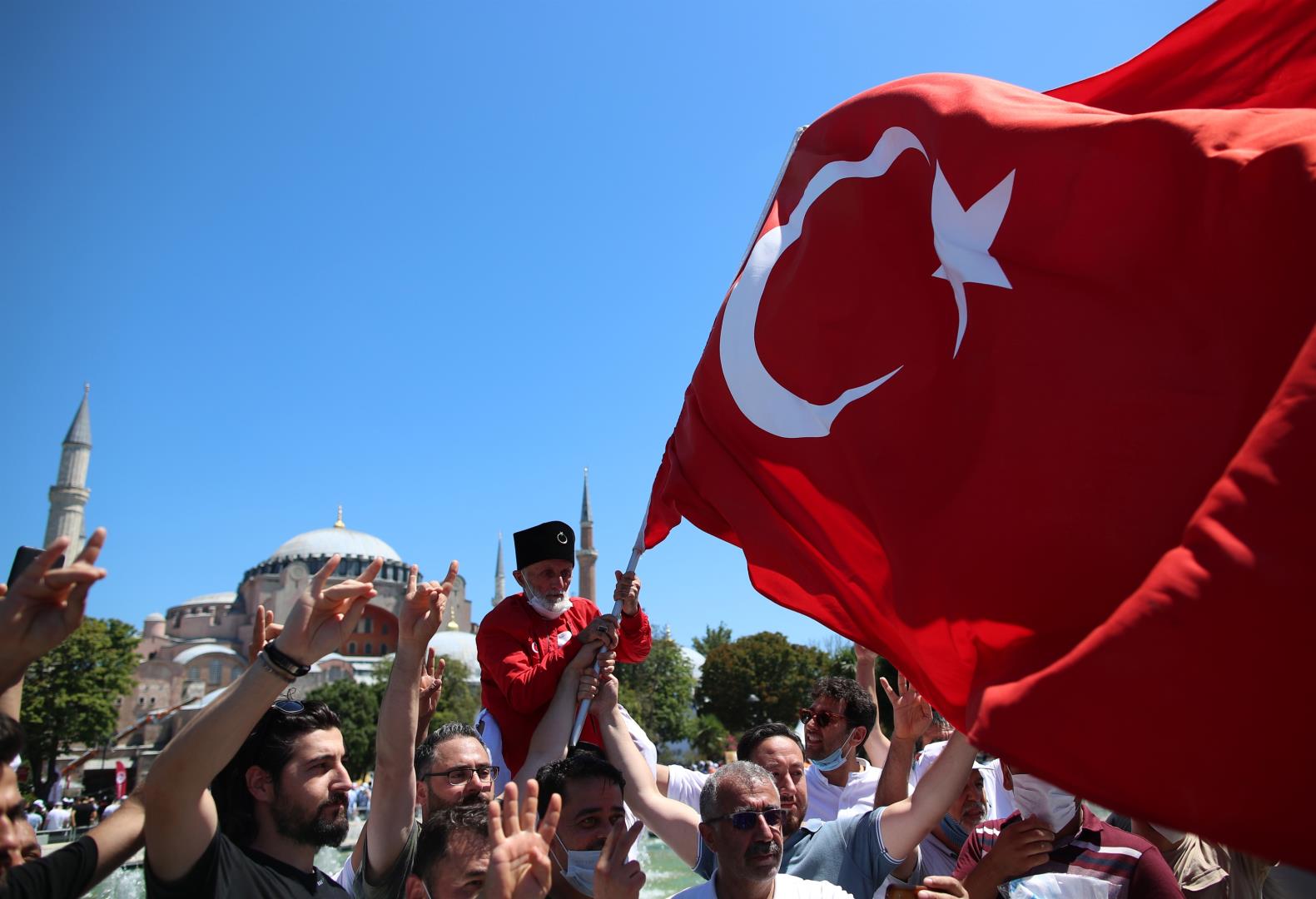 Με αμέτρητες σημαίες της Τουρκίας, μπλούζες που αναφέρονταν στην Άλωση της Κωνσταντινούπολης και σχηματίζοντας με τα χέρια το σήμα των Γκρίζων Λύκων, χιλιάδες Τούρκοι γιόρτασαν έξω από την Αγία Σοφιά τη μετατροπή της σε τζαμί, ύστερα από 86 χρόνια.