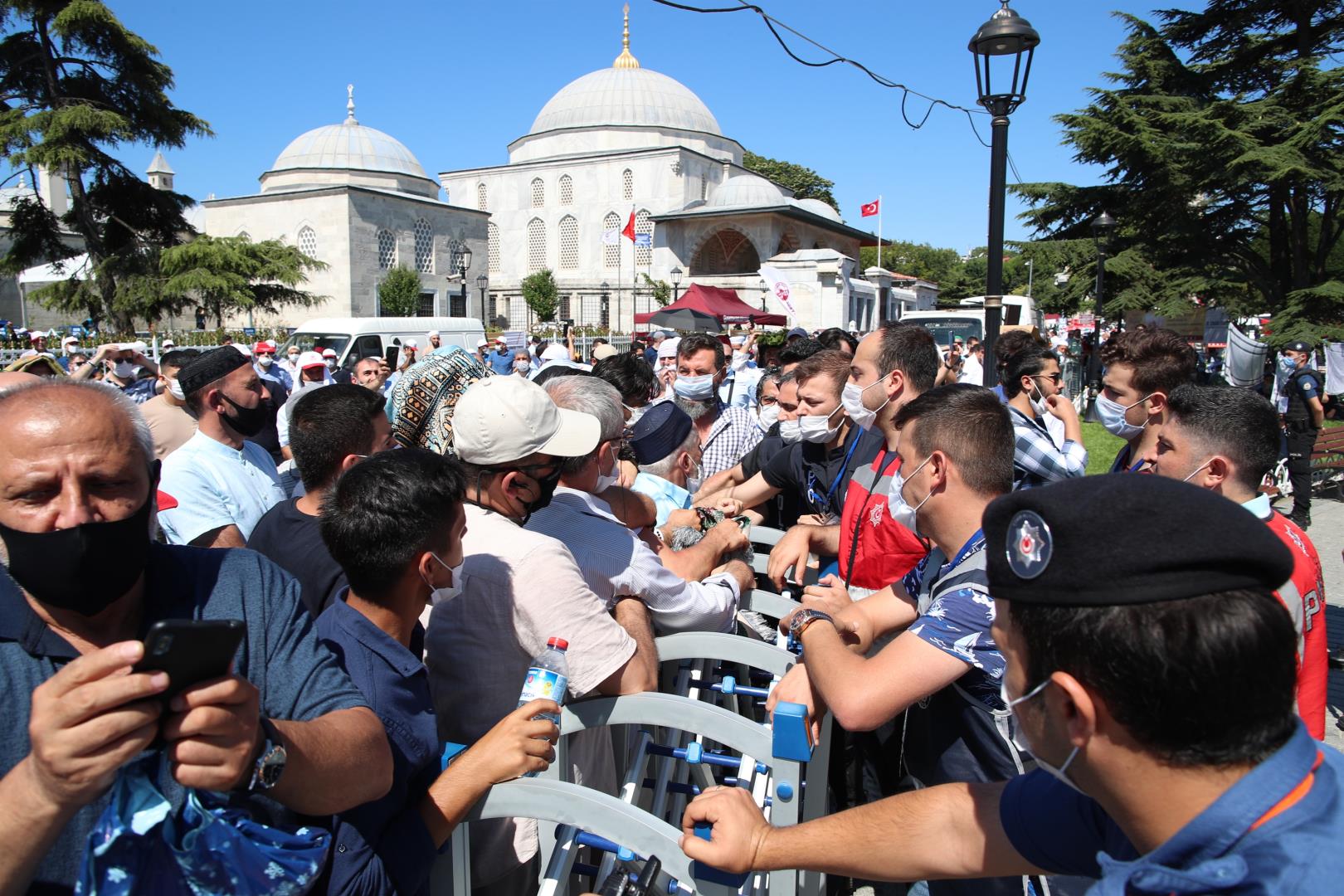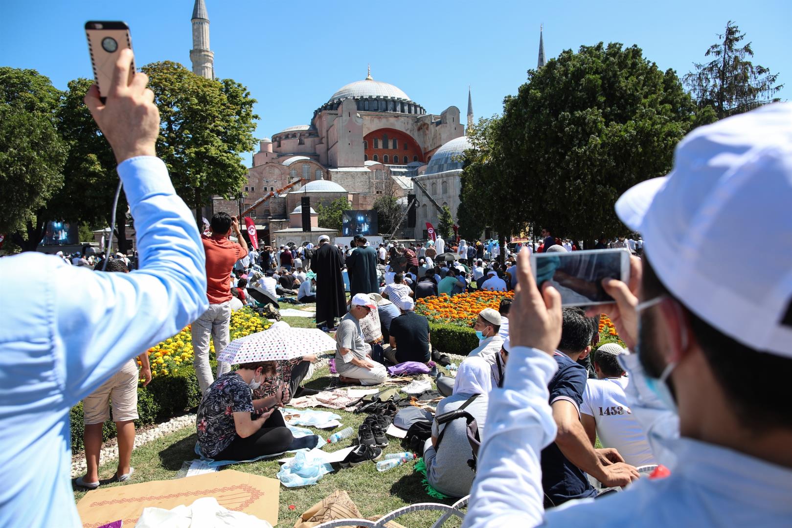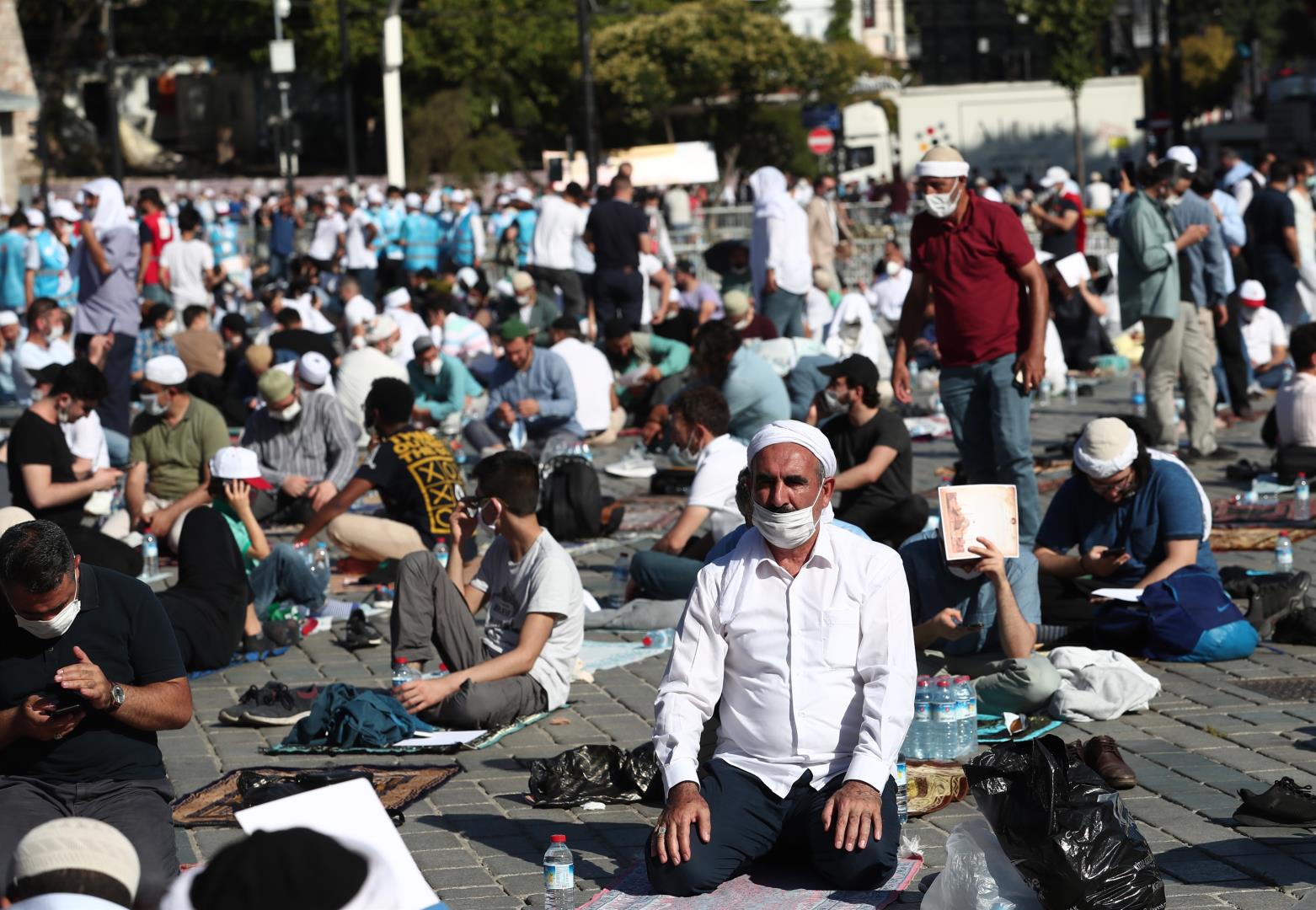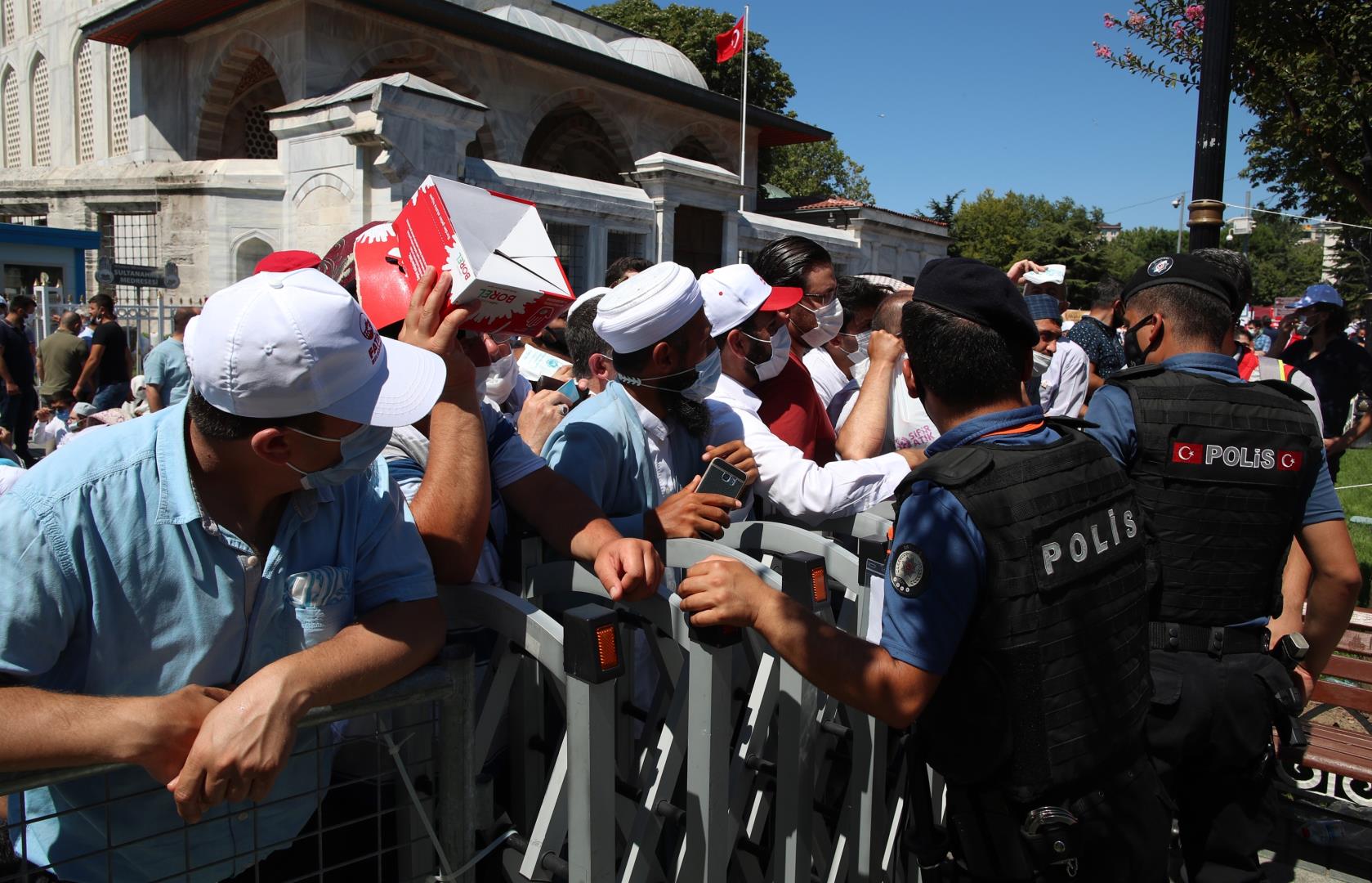 Χιλιάδες κόσμου έσπευσαν έξω απ’ την Αγία Σοφία με το πρώτο φως της μέρας. Άλλοι βρέθηκαν στην πλατεία, μπροστά απ’ την Αγία Σοφία από το βράδυ προκειμένου να προλάβουν να κρατήσουν χώρο για την πρωινή προσευχή.