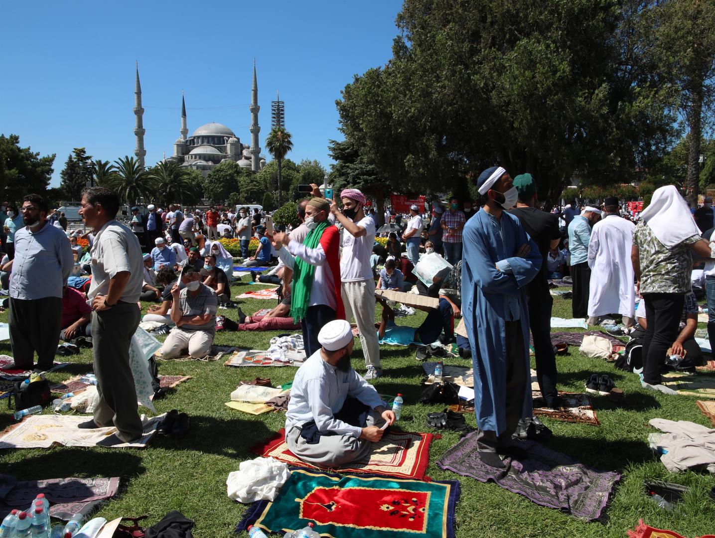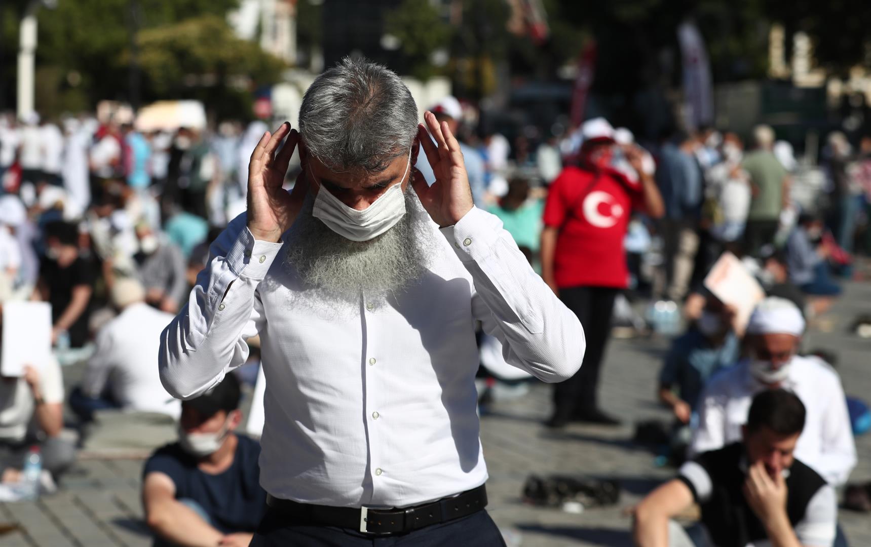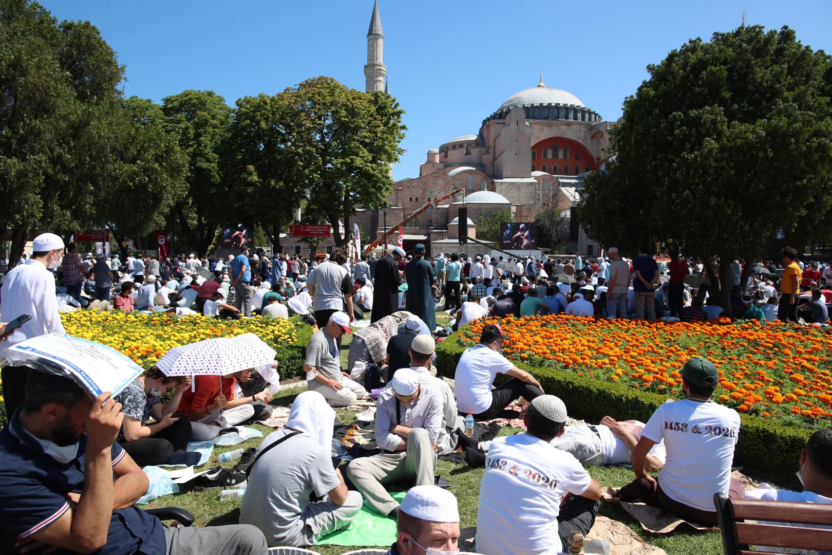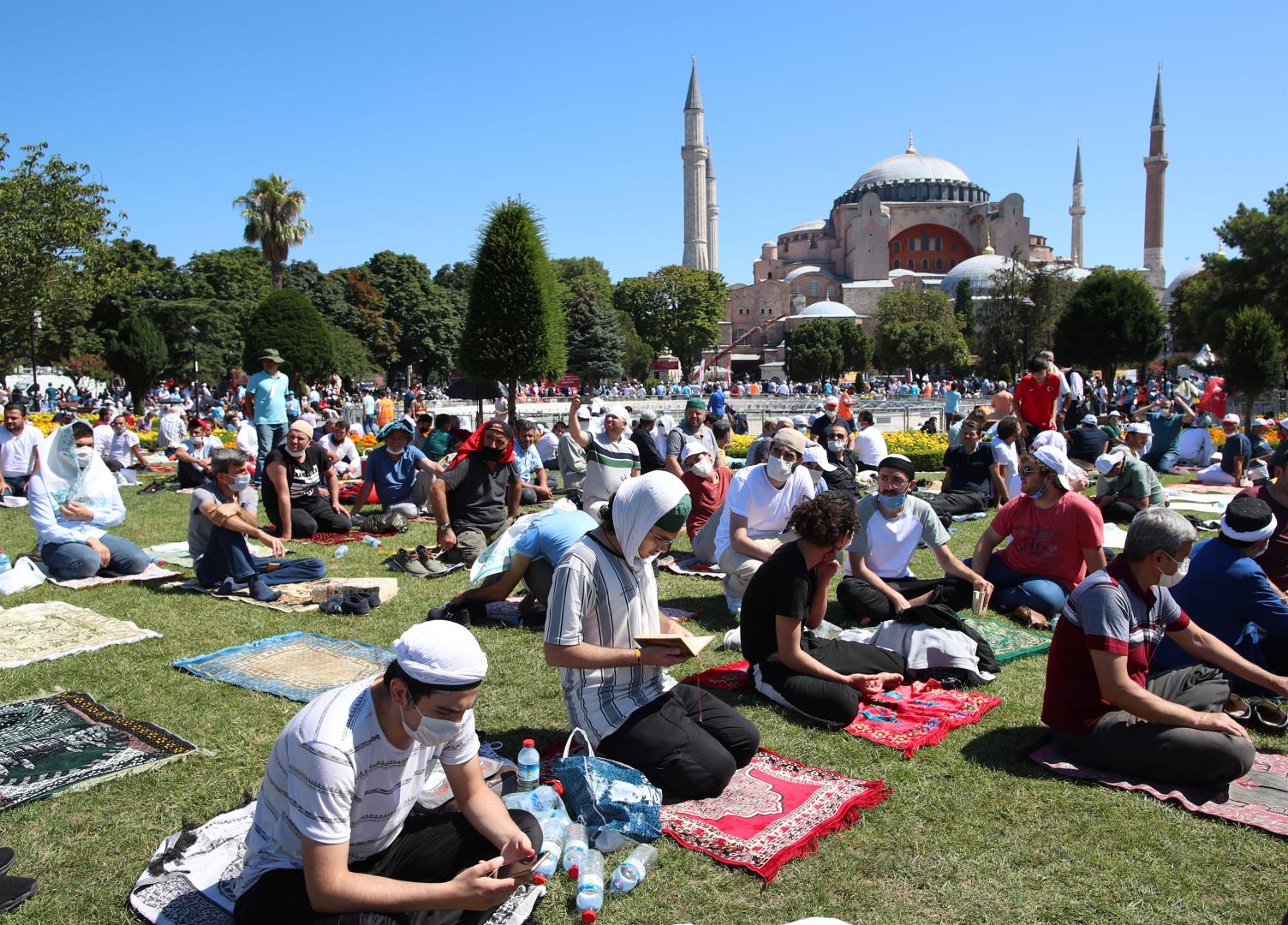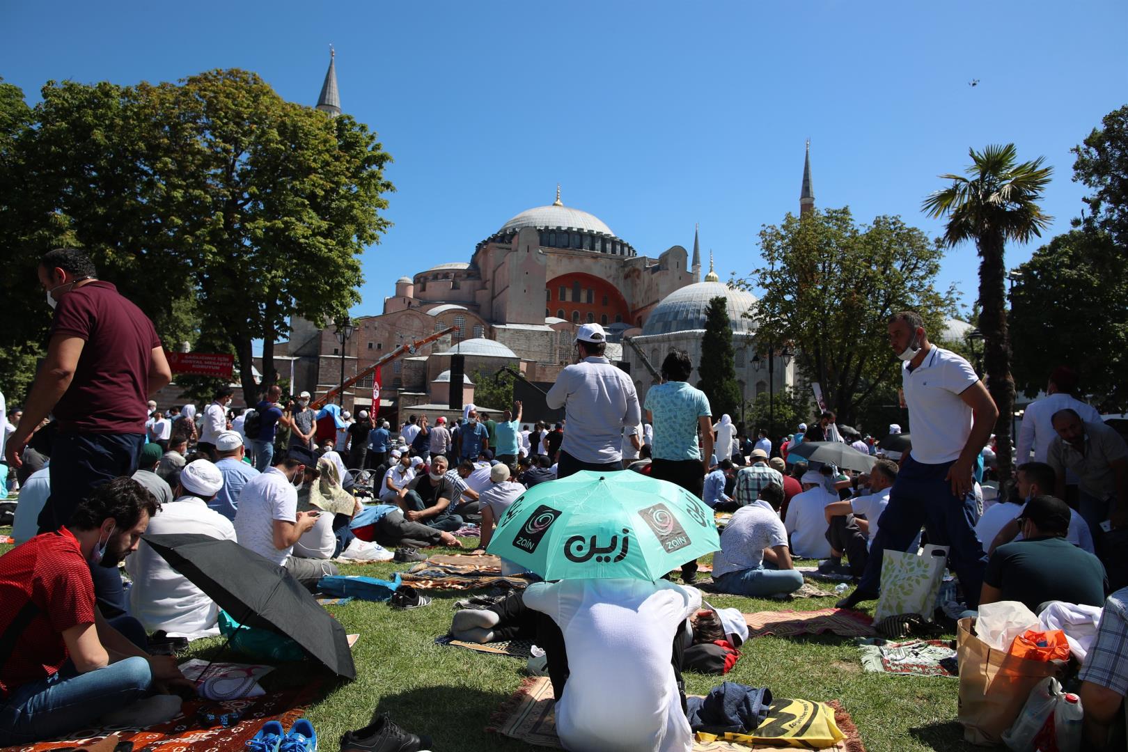 Χιλιάδες κόσμου έσπευσαν έξω απ’ την Αγία Σοφία με το πρώτο φως της μέρας. Άλλοι βρέθηκαν στην πλατεία, μπροστά απ’ την Αγία Σοφία από το βράδυ προκειμένου να προλάβουν να κρατήσουν χώρο για την πρωινή προσευχή.