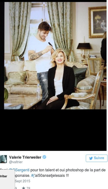 Η φωτογραφία της αγνώριστης Βαλερί έκανε αμέσως τον γύρο του διαδικτύου με απίστευτα ειρωνικά σχόλια. Η Βαλερί Τριερβελέρ πόζαρε στο γιαπωνέζικο περιοδικό για να γιορτάσει τα πρώτα γενέθλια απο το βιβλίο της «Ευχαριστώ γι’αυτή τη στιγμή», το οποίο έγινε μπεστ σέλλερ παγκόσμια. Για την φωτογράφιση πόζαρε με look χόλιγουντ: μαύρο φόρεμα, κοσμήματα λαμπερά, ξανθά μαλλιά με κύματα και πανήψυλες μαύρες γόβες.