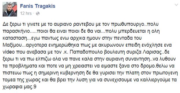 Ενα βίντεο που «ανέβασε» στον προσωπικό του λογαριασμό στο Facebook, με πρωταγωνιστή τον βουλευτή Λάρισας του ΣΥΡΙΖΑ Νίκο Παπαδόπουλο, φαίνεται πως ήταν η αιτία να μην παραστεί στη συνάντηση με τον πρωθυπουργό στο Μέγαρο Μαξίμου ο αγρότης Φάνης Τραγάκης.