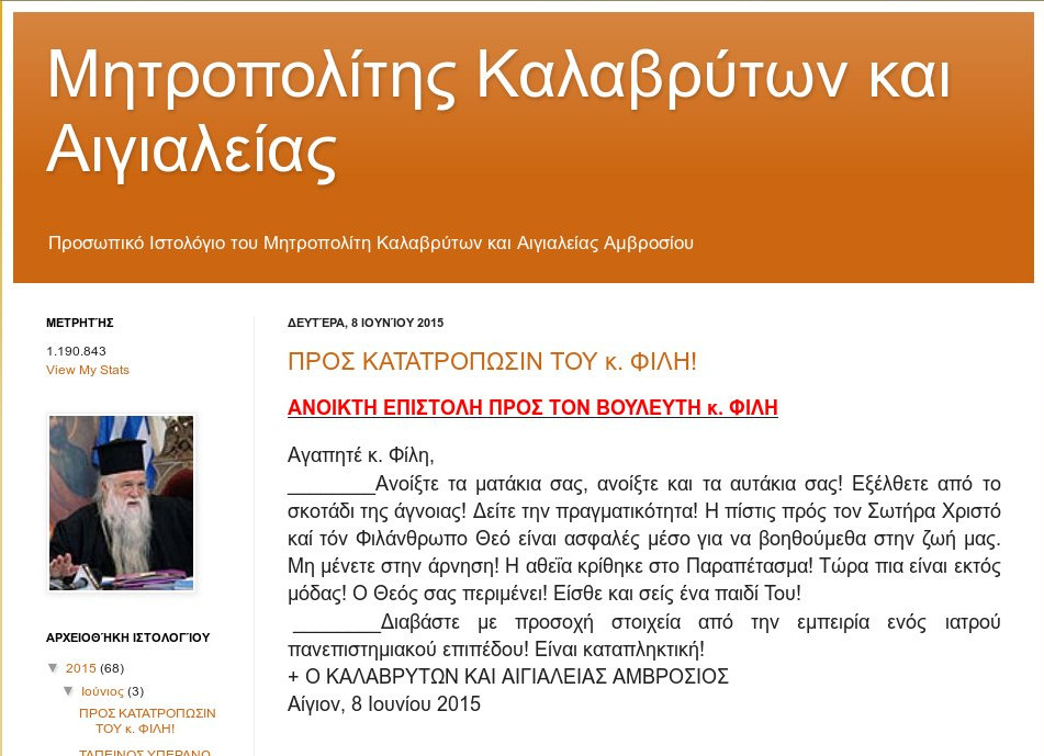 «Η αθεΐα κρίθηκε στο Παραπέτασμα. Τώρα πια είναι εκτός μόδας» αναφέρει σε επιστολή του προς τον Νίκο Φίλη, ο Μητροπολίτης Καλαβρύτων και Αιγιαλείας Αμβρόσιος.