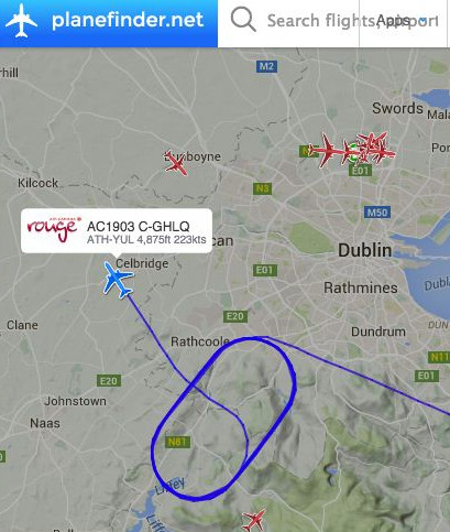 Πρόκειται για την πτήση AC 1903 που αναχώρησε από την Αθήνα στις 11:50 με τελικό προορισμό το Mόντρεαλ. Το Boeing 767 έκανε κύκλους πάνω από το Δουβλίνο προκαλώντας ανησυχία στους επιβάτες.