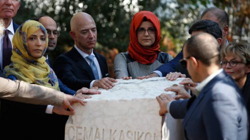 Τα αποκαλυπτήρια αναμνηστικής στήλης έγιναν κατά την τελετή στη μνήμη του Τζαμάλ Κασόγκι, που οργανώθηκε χθες στην Κωνσταντινούπολη, παρουσία του Τζεφ Μπέζος, του ιδιοκτήτη της Washington Post, με την οποία συνεργαζόταν ο Σαουδάραβας δημοσιογράφος που δολοφονήθηκε στο προξενείο της χώρας του.