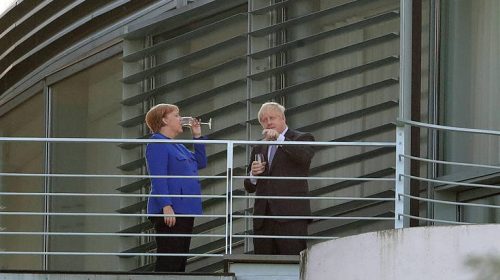 Ο φωτογραφικός φακός απαθανάτισε τους δυο ηγέτες να πίνουν τα ποτά τους – η Άνγκελα Μέρκελ ένα ποτήρι κρασί ενώ ο Μπόρις Τζόνσον ένα ποτό – μιλώντας στο μπαλκόνι.