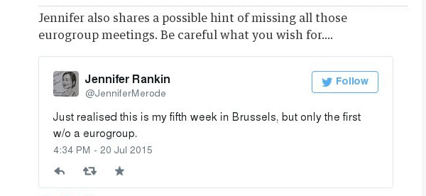 Η Τζένιφερ Ράνκιν μάλιστα έγραψε στον λογαριασμό της στο Twitter «Μόλις συνειδητοποίησα ότι είναι η 5η εβδομάδα μου στις Βρυξέλλες αλλά μόλις η πρώτη μου δίχως Eurogroup».