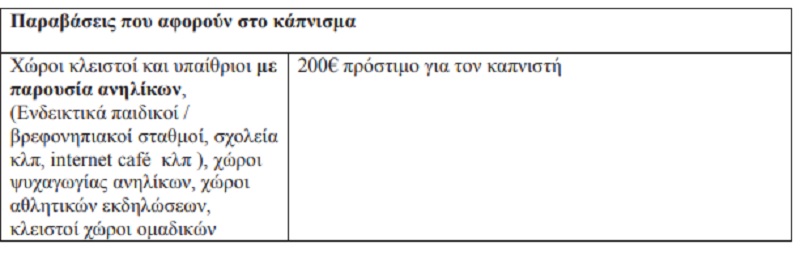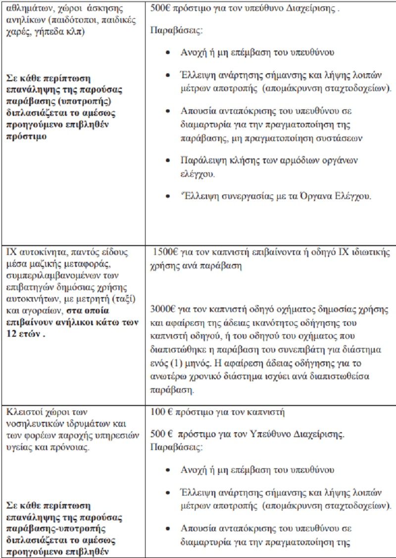 Η απόφαση αναφέρει αναλυτικά τους χώρους, αλλά και τα πρόστιμα που κόβονται στον εκάστοτε επιχειρηματία ή καπνιστή. Μεταξύ άλλων θα επιβάλλεται 200 ευρώ πρόστιμο σε άτομα που καπνίζουν σε κλειστούς χώρους και υπαίθριους, ενώ 500 ευρώ για τον υπεύθυνο Διαχείρισης.