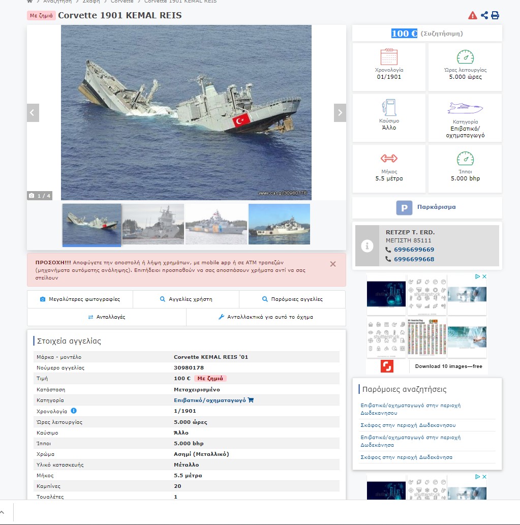 Σε σελίδα, που πωλούνται μεταχειρισμένα αυτοκίνητα, μπήκε αγγελία -προφανώς και  ψεύτικη- για την αγορά του Kemal Reis. Μάλιστα, η τιμή πώλησής του είναι 100 ευρώ και αναφέρει ότι έχει ζημιά, ενώ στην περιγραφή αναφέρει:
