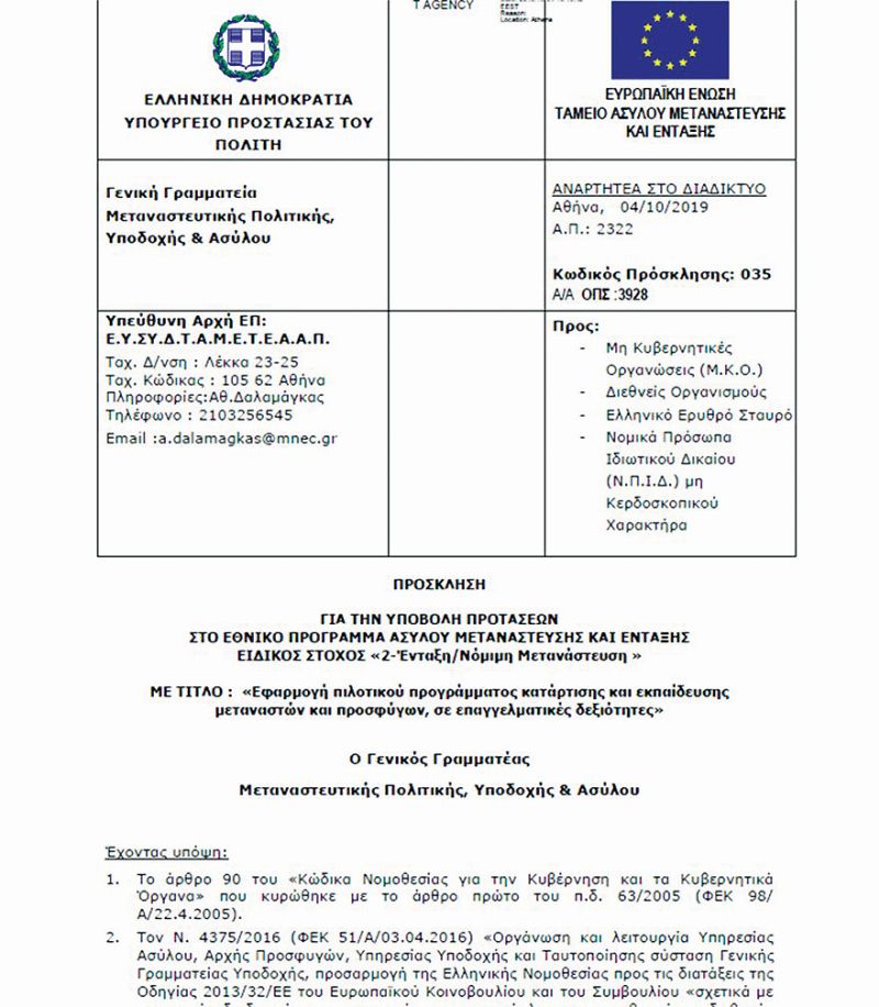 Όπως αναφέρεται στην πρόσκληση, «η δράση αφορά την εφαρμογή του πιλοτικού προγράμματος επαγγελματικής κατάρτισης, ανταλλαγής και αναβάθμισης δεξιοτήτων και πρόσβασης σε εργασιακά περιβάλλοντα για άνεργους πρόσφυγες και μετανάστες».