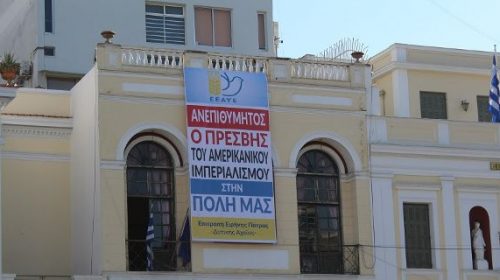 Μεγάλες αντιδράσεις έχει προκαλέσει η πρωτοβουλία του Δημάρχου Πατρέων- που υποστηρίζεται απο το ΚΚΕ- να αναρτήσει πανό στο Μέγαρο Λόγου και Τέχνης της πόλης, με το οποίο χαρακτηρίζεται ανεπιθύμητος στην πόλη, ο Αμερικανός πρέσβης Τζέφρι Πάιατ.