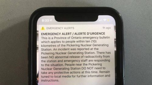 Γύρω στις 7:30 τοπική ώρα, χρήστες κινητού στο Οντάριο δέχθηκαν ένα μήνυμα συναγερμού για ένα υποτιθέμενο περιστατικό στο εργοστάσιο Πίκερινγκ. Λιγότερο από μια ώρα αργότερα οι αρμόδιες Αρχές ανακοίνωσαν ότι το μήνυμα ήταν εσφαλμένο.