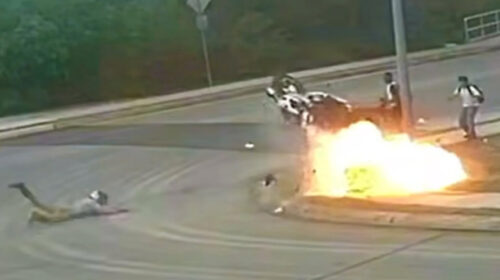 Στο βίντεο βλέπουμε τον αναβάτη να χάνει ξαφνικά τον έλεγχο. Η μηχανή αρχίζει να σέρνεται με τεράστια φόρα στην άσφαλτο, προσκρούει και μέσα σε δευτερόλεπτα τυλίγεται στις φλόγες σαν πύρινη μπάλα. Ο οδηγός εκτοξεύεται, σέρνεται στο έδαφος και μέσα στον πανικό του καταφέρνει να σηκωθεί και να τρέξει μακριά.