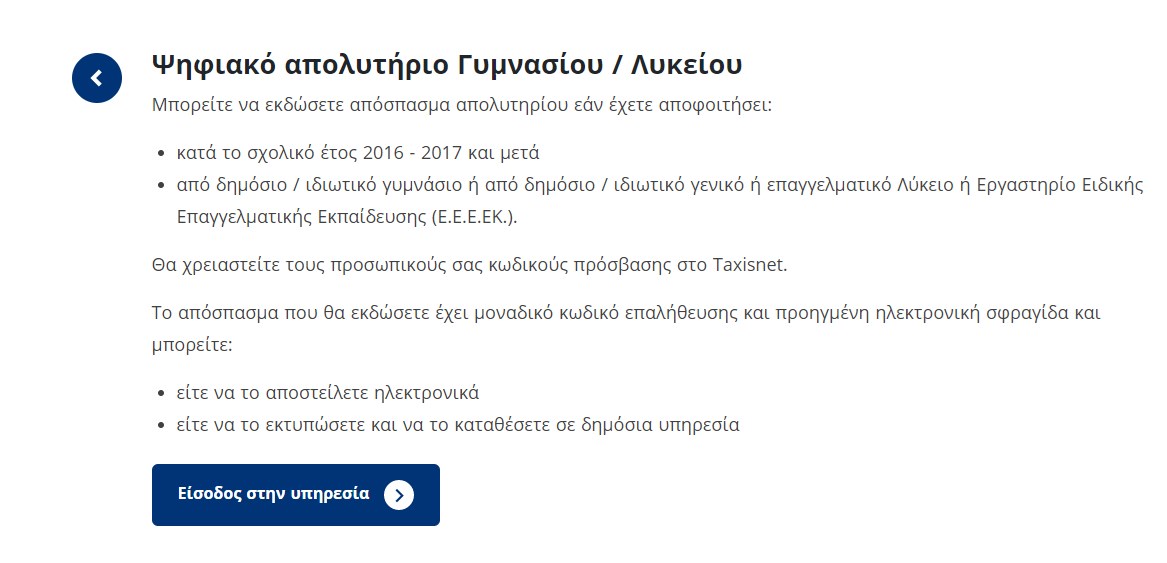Τη δυνατότητα να εκδίδουν ψηφιακά το απολυτήριο ή το πτυχίο τους έχουν οι απόφοιτοι Γυμνασίων, Λυκείων και Επαγγελματικών Λυκείων από το σχολικό έτος 2016-2017 και εξής, καθώς είναι διαθέσιμες οι σχετικές υπηρεσίες στο gov.gr.