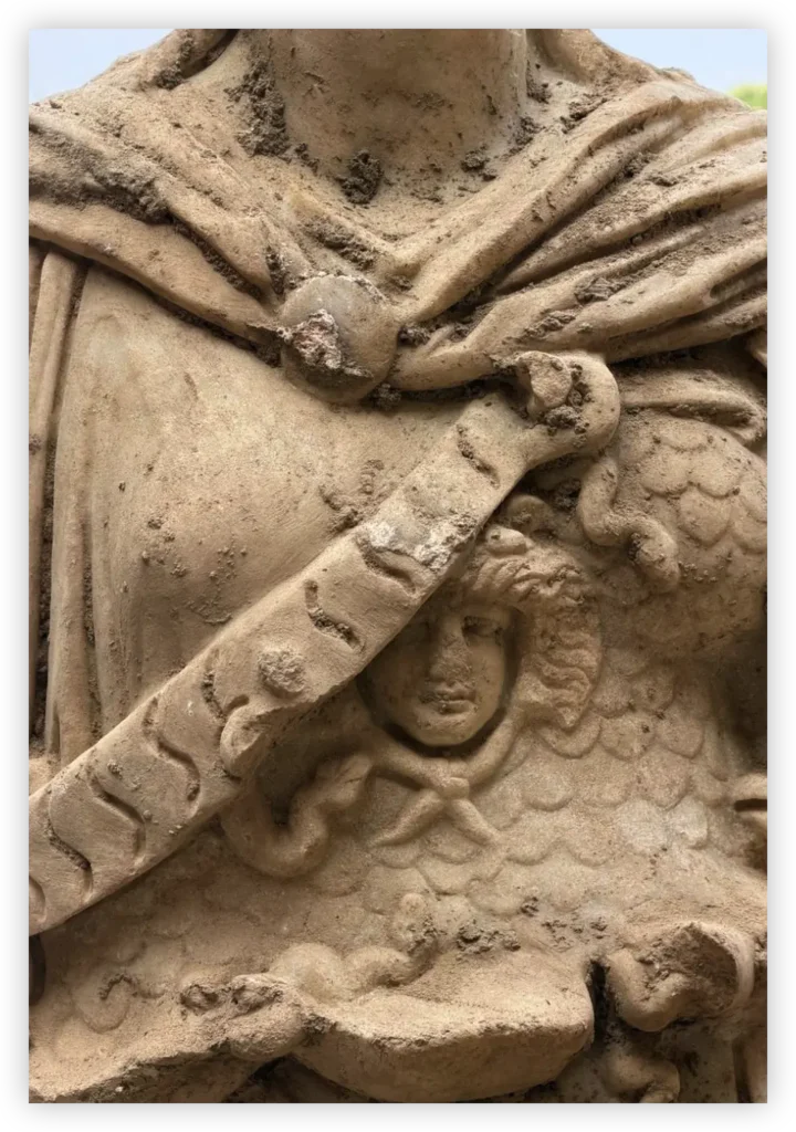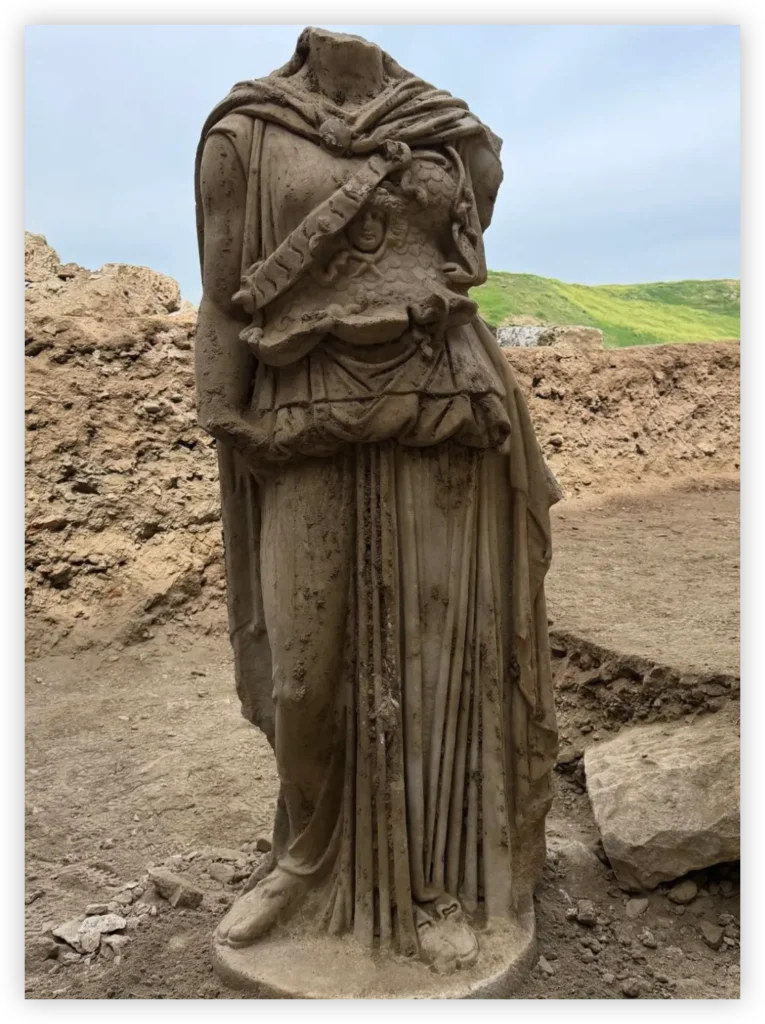 Το άγαλμα ήταν κρυμμένο μέσα σε γκρεμισμένους τοίχους και χώματα σε ένα αρχαίο θέατρο. Οι επιστήμονες το βρήκαν να πέφτει μπρούμυτα. Αν και του λείπει το κεφάλι, το σώμα του είναι σε πολύ καλή κατάσταση.