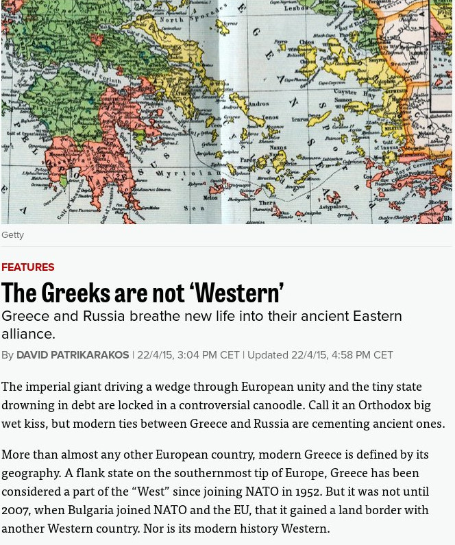 Το άρθρο υπό τον τίτλο «Οι Ελληνες δεν είναι Δυτικοί» πιάνει το νήμα από την αρχή: Από το… κυριλλικό αλφάβητο, την ομόδοξο της ορθοδοξίας, τον Καποδίστρια και τον εμφύλιο και το υπογράφει ο David Patrikarakos. Περιγράφει τις δύσκολες σχέσεις με την Ε.Ε. και την προσέγγιση με τη Ρωσία από την κυβέρνηση του ΣΥΡΙΖΑ