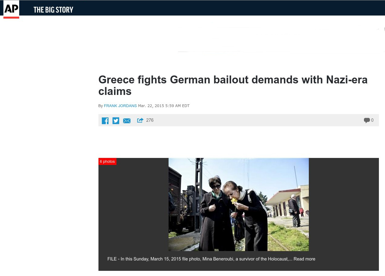 Το αμερικανικό πρακτορείο φιλοξενεί δηλώσεις του προέδρου της Ισραηλίτικης Κοινότητας Θεσσαλονίκης, «της μεγαλύτερης εβραϊκής κοινότητας στην Ελλάδα» διευκρινίζει το AP για το αμερικανικό κοινό, Δαυίδ Σαλτιέλ. Ο κ. Σαλτιέλ τονίζει ότι πλέον η Κοινότητα προσανατολίζεται, 70 χρόνια μετά τη λήξη του πολέμου, να διεκδικήσει από τη Γερμανία τα ποσά που είχαν καταβάλει οι Εβραίοι της Θεσσαλονίκης ως το αντίτιμο του εισιτηρίου για το ταξίδι με το τρένο προς τα στρατόπεδα-κολαστήρια. «Θα μελετήσουμε τη νομοθεσία και θα ενεργήσουμε με τον καλύτερο δυνατό τρόπο προς τη διεκδίκηση» δήλωσε στο Associated Press o Σαλτιέλ.
