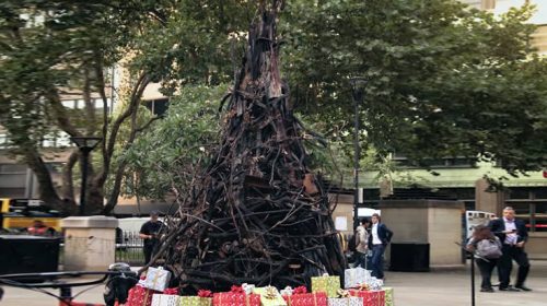 Το δέντρο φτιάχτηκε και διακοσμήθηκε με καψαλισμένους κορμούς, ένα καμένο ποδήλατο, έναν αχρηστευμένο συναγερμό πυρκαγιάς και άλλα κατεστραμμένα αντικείμενα του σπιτιού, που περιβάλλονται από δώρα τυλιγμένα σε κόκκινο, ασημί και χρυσό γυαλιστερό χαρτί.