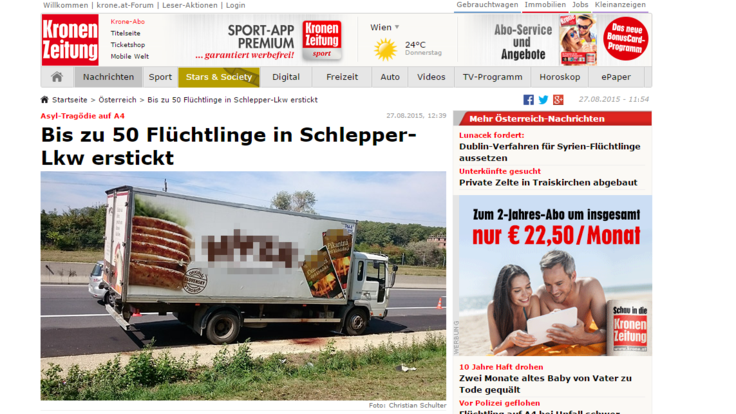 Έως και 50 πρόσφυγες βρέθηκαν σήμερα νεκροί σε ένα σταθμευμένο φορτηγό στην ανατολική Αυστρία, σύμφωνα με την εφημερίδα Krone, η οποία ανέφερε πως από τις αρχικές ενδείξεις προκύπτει πως πέθαναν από ασφυξία.