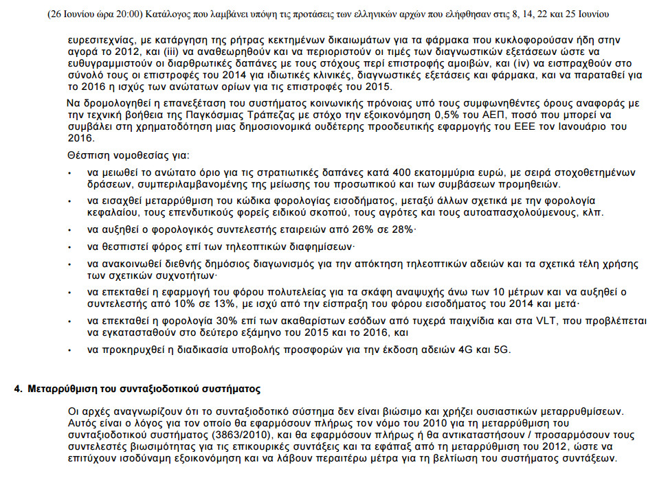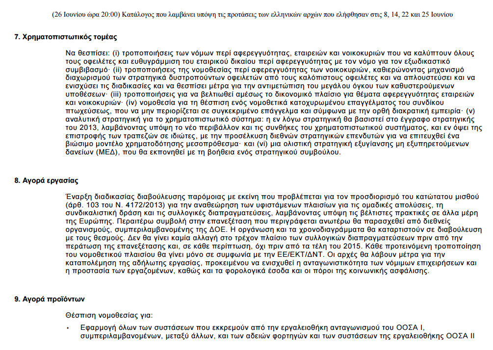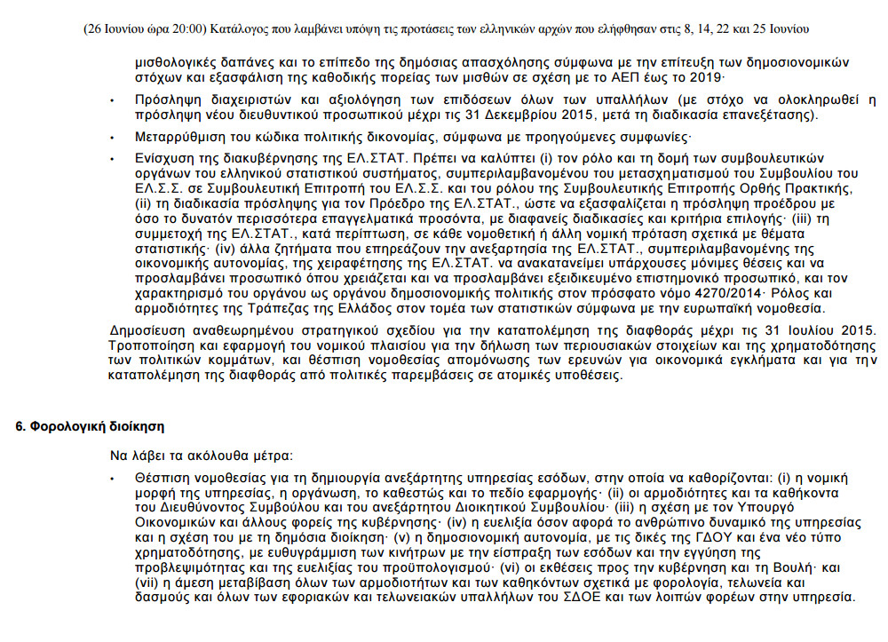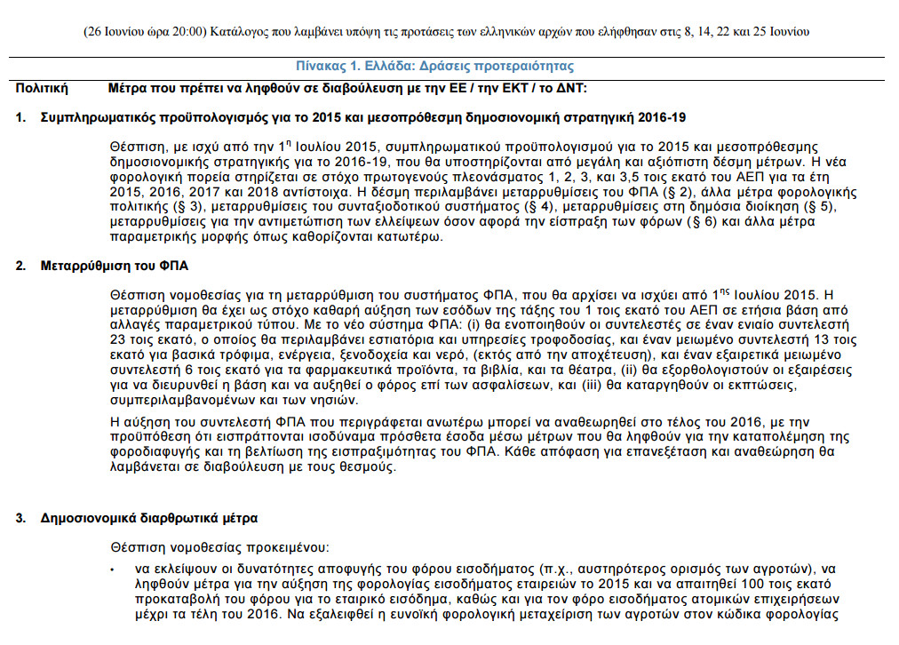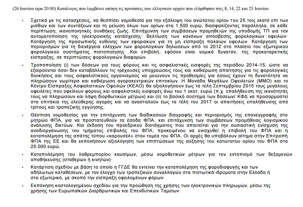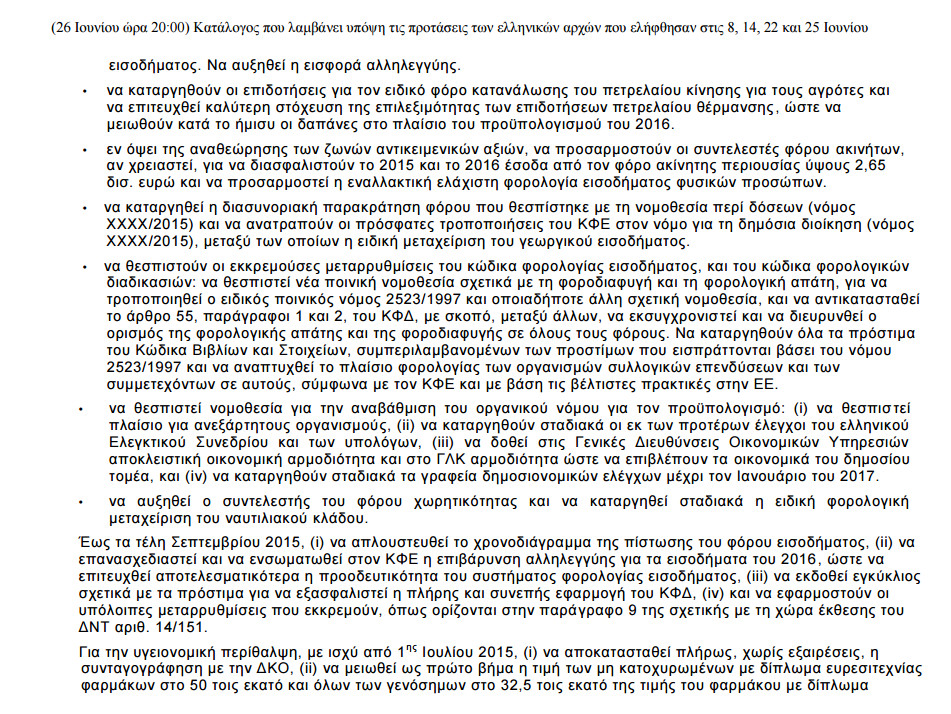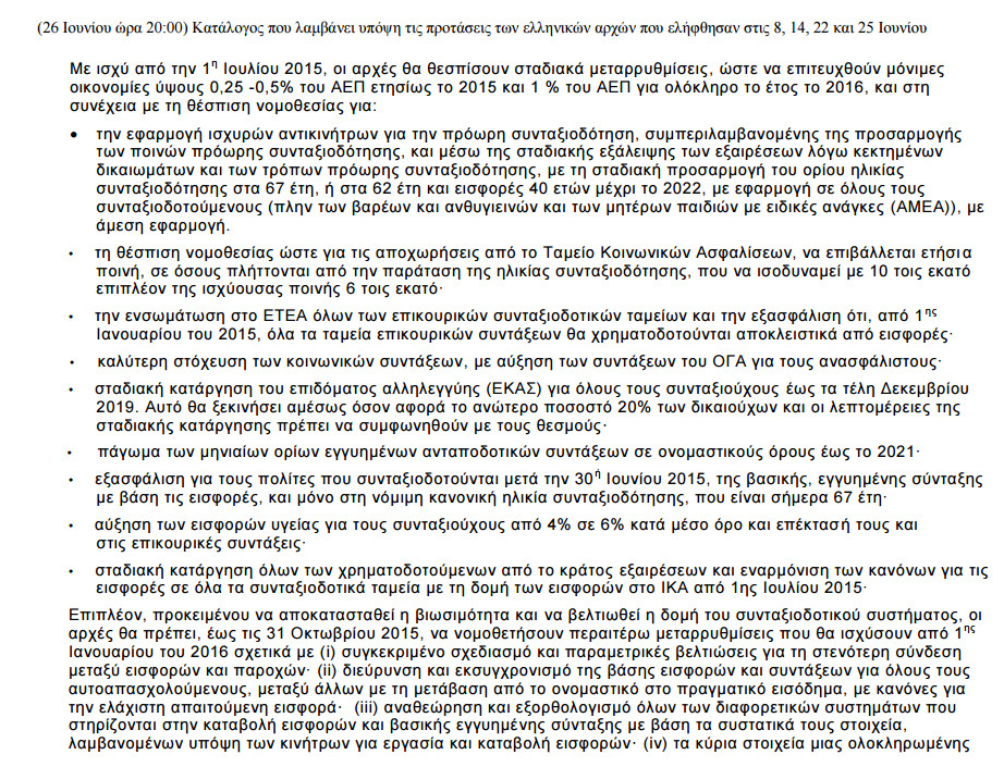 «Για την ενημέρωση του ελληνικού λαού και σε πνεύμα διαφάνειας, η Ευρωπαϊκή Επιτροπή δημοσιεύει τις τελευταίες προτάσεις όπως συμφωνήθηκαν με τους θεσμούς (Ευρωπαϊκή Επιτροπή, Ευρωπαϊκή Κεντρική Τράπεζα, Διεθνές Νομισματικό Ταμείο) οι οποίες λαμβάνουν υπόψη τις προτάσεις των ελληνικών αρχών της 8ης, 14ης, 22ας και 25ης Ιουνίου 2015, αλλά και τις συνομιλίες σε πολιτικό και τεχνικό επίπεδο καθ’ όλη τη διάρκεια της εβδομάδας.