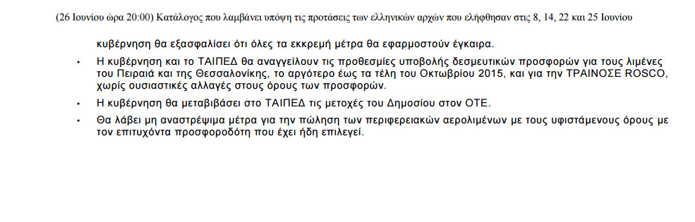 «Για την ενημέρωση του ελληνικού λαού και σε πνεύμα διαφάνειας, η Ευρωπαϊκή Επιτροπή δημοσιεύει τις τελευταίες προτάσεις όπως συμφωνήθηκαν με τους θεσμούς (Ευρωπαϊκή Επιτροπή, Ευρωπαϊκή Κεντρική Τράπεζα, Διεθνές Νομισματικό Ταμείο) οι οποίες λαμβάνουν υπόψη τις προτάσεις των ελληνικών αρχών της 8ης, 14ης, 22ας και 25ης Ιουνίου 2015, αλλά και τις συνομιλίες σε πολιτικό και τεχνικό επίπεδο καθ’ όλη τη διάρκεια της εβδομάδας.