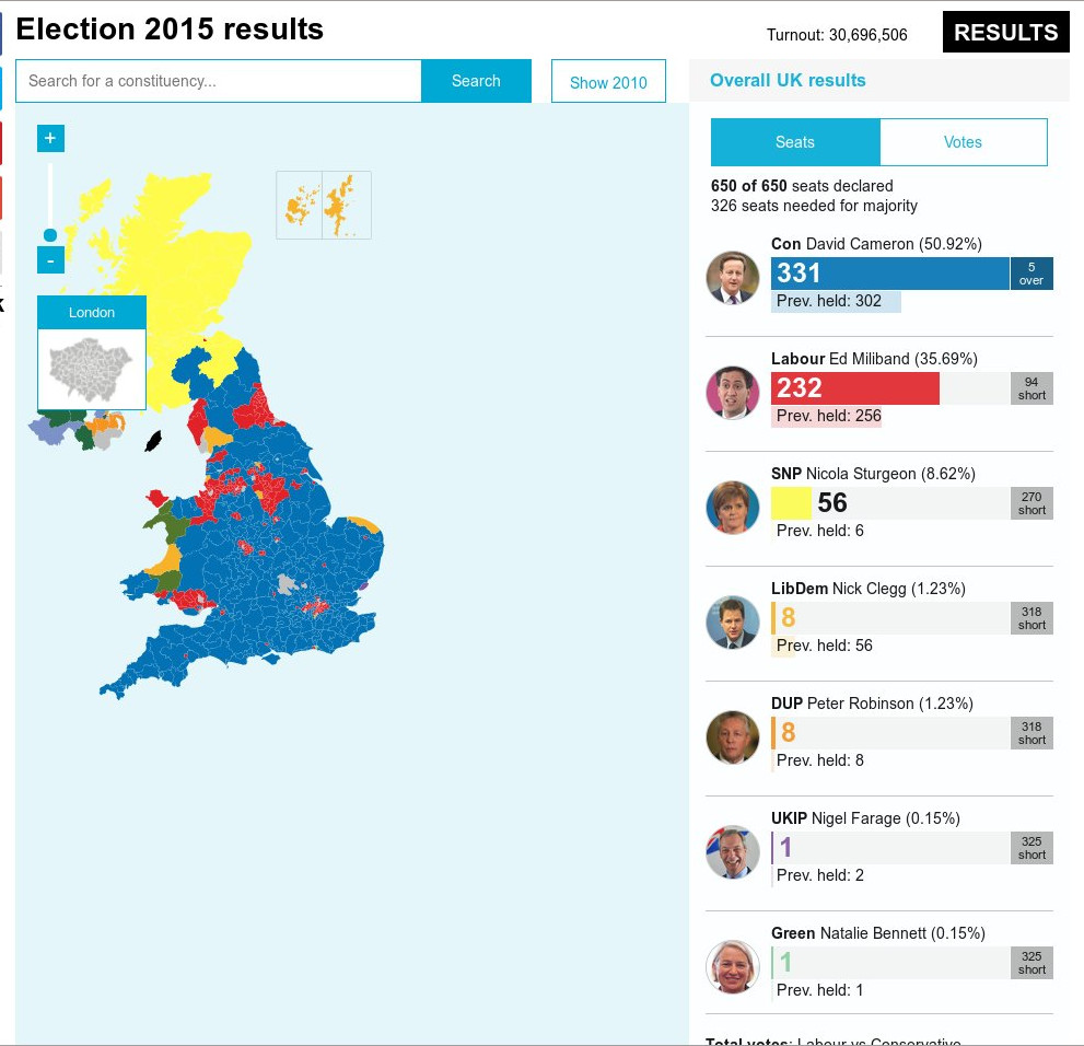 Αναφορικά με τις ψήφους, το Συντηρητικό Κόμμα βελτίωσε τις επιδόσεις του, σε σύγκριση με τις εκλογές του 2010, σημειώνοντας άνοδο 0,8%, αφού συγκέντρωσε το 36,6% των ψήφων, ήτοι 11,33 εκατομμύρια ψήφοι. Κέρδισε έτσι 24 επιπλέον έδρες, γεγονός που του επιτρέπει να περάσει το όριο των 326 βουλευτών, που συνιστά την απόλυτη πλειοψηφία στη Βουλή των Κοινοτήτων.