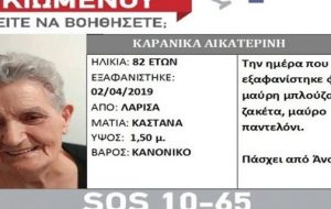 Ανακοίνωση με την οποία γνωστοποιεί την εξαφάνιση μιας ηλικιωμένης από τη Λάρισα εξέδωσε η Γραμμή Ζωής. Πρόκειται για την Αικατερίνη… [5 Απριλίου, 2019 - 05:17]