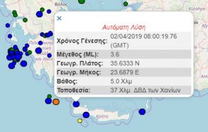 Σεισμική δόνηση, μεγέθους 4 βαθμών της κλίμακας Ρίχτερ και με επίκεντρο τα Χανιά, σημειώθηκε στην Κρήτη. Ο σεισμός καταγράφηκε στις… [2 Απριλίου, 2019 - 11:27]