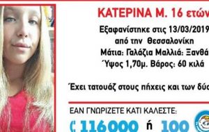 Την εξαφάνιση της 16χρονης Κατερίνας Μ. από τη Σταυρούπολη Θεσσαλονίκης γνωστοποίησε με ανακοίνωσή του, το «Χαμόγελο του Παιδιού». Η 16χρονη… [16 Μαρτίου, 2019 - 05:07]