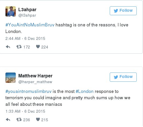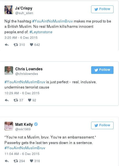 Αυτό ακούγεται και σε βίντεο που δημοσιεύθηκε στο Twitter. Και η φράση δεν άρχισε να γίνει «σύνθημα», με το hashtag #YouAintNoMuslimBruv να σαρώνει στο Twitter.