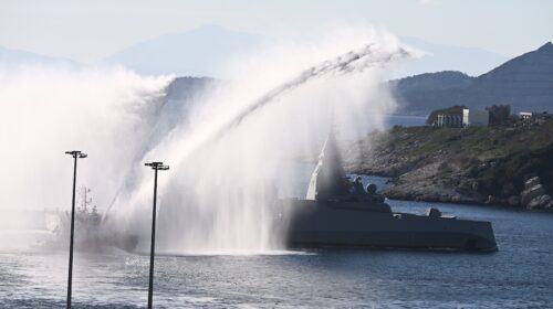 Αυτό που τραβάει αμέσως το μάτι στο βίντεο, είναι η στιγμή της υποδοχής στη θάλασσα. Δύο μικρότερα πλοία σχημάτισαν μια τεράστια υδάτινη «αψίδα», πετώντας πίδακες νερού στον αέρα για να τιμήσουν τον ερχομό της «Κίμων».