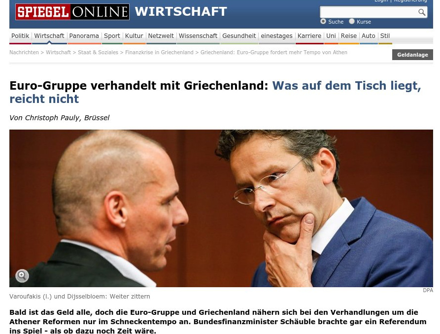 «Ηταν μια μικρή βόμβα από τον Βολφγκανγκ Σόιμπλε, λίγο πριν τη συνάντηση των υπουργών Οικονομικών, να πει πως ”και η εναλλακτική που έχει η Ελλάδα εναπόκειται στην ίδια κι αν η ελληνική κυβέρνηση είναι της γνώμης ότι πρέπει να κάνει δημοψήφισμα, ας το κάνει. Ίσως να ήταν κι ένα σωστό μέτρο να αφεθεί ο ελληνικός λαός να αποφασίσει αν είναι έτοιμος να αποδεχθεί αυτό που είναι αναγκαίο ή αν θα επιλέξει το άλλο”», αναφέρει το δημοσίευμα και συνεχίζει λέγοντας πως «ο Σόιμπλε ζήτησε την διεξαγωγή δημοψηφίσματος, που η κυβέρνηση με την ημερομηνία είχε απειλήσει τους Ευρωπαίους».