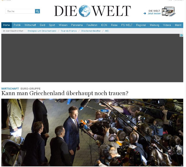 Στο πρώτο θέμα στη διαδικτυακή έκδοση της γερμανικής εφημερίδας, ο τίτλος είναι «Μπορεί να εμπιστευτεί κάποιος την Ελλάδα ακόμα;» και φαίνεται ότι αντικατοπτρίζει τις διαθέσεις των υπουργών Οικονομικών της ευρωζώνης, όπως αυτές εκφράστηκαν στη χθεσινή σύσκεψη.