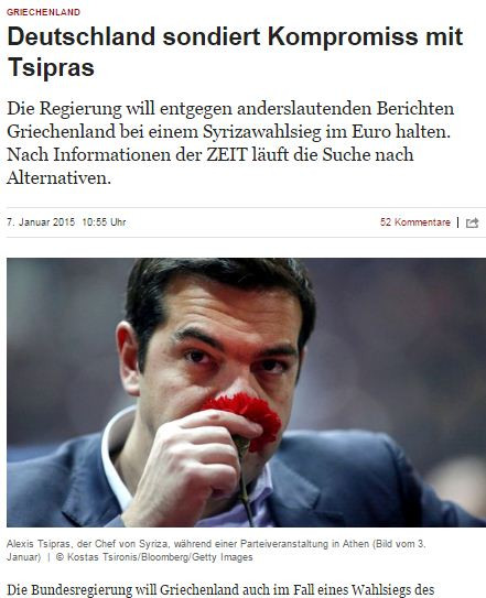 Επικαλούμενη πηγές από το Βερολίνο και τις Βρυξέλλες, η εφημερίδα υποστηρίζει: «Εξετάζεται αυτή την εποχή πώς θα μπορούσε να είναι ένας πιθανός συμβιβασμός με τον Αρχηγό του ΣΥΡΙΖΑ Αλέξη Τσίπρα» και εξηγεί: «Μια έξοδος της Ελλάδας θεωρείται για την γερμανική κυβέρνηση οικονομικά επικίνδυνη και πολιτικά κοστοβόρα – παρά τα περί του αντιθέτου δημοσιεύματα».
