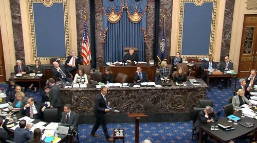Οι 100 γερουσιαστές που θα αποφασίσουν για το αν θα απομακρυνθεί ο πρόεδρος Ντόναλντ Τραμπ από τον Λευκό Οίκο, στο τέλος της δίκης που διεξάγεται στην Γερουσία κατόρθωσαν χθες να παραμείνουν στις θέσεις τους και να ακούσουν την επιχειρηματολογία των Δημοκρατικών κατά του Αμερικανού προέδρου, για περίπου 20 λεπτά.