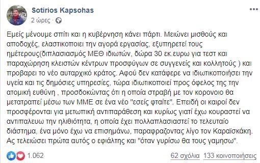 Με μια απαράδεχτη χυδαιολογία καταφέρθηκε εναντίον της κυβέρνησης ο δημοσιογράφος Σωτήρης Καψώχας, ο οποίος, σύμφωνα με πληροφορίες, προσελήφθη πρόσφατα στο γραφείο τύπου της κοινοβουλευτικής ομάδας του ΣΥΡΙΖΑ, σχετικά με τον κορωνοϊό.