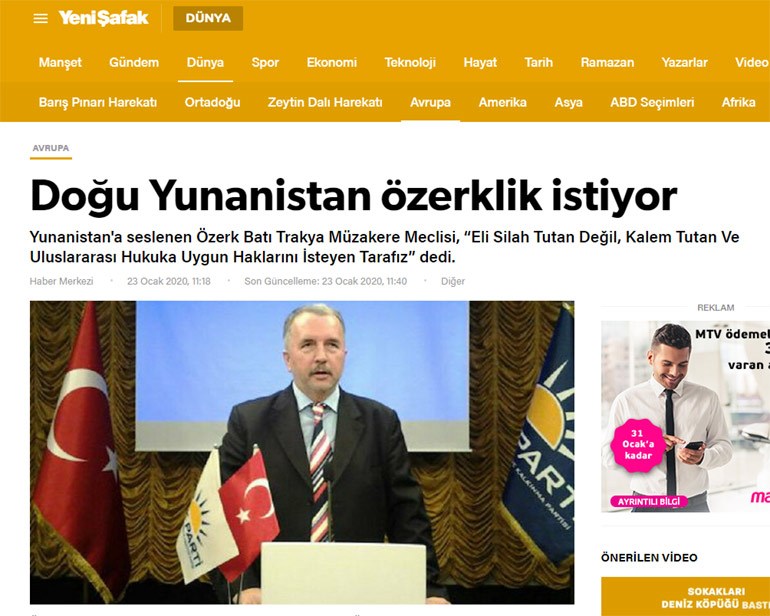 Συγκεκριμένα, η κυβερνητική εφημερίδα «Yeni Safak», η οποία θεωρείται το επίσημο όργανο του τούρκου Προέδρου, Ταγίπ Ερντογάν, δημοσιεύει κάποιον, Ferruh Ozkan, ο οποίος εμφανίζεται ως πρόεδρος της «Ιδρυτικής Βουλής Δυτικής Θράκης». Μάλιστα, υπογράφει επιστολή προς την ελληνική κυβέρνηση, ζητώντας την δημιουργία ειδικού καθεστώτος εκεί, έως την 21η Αυγούστου 2020.