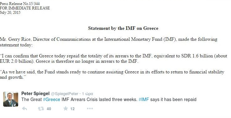 «Μπορώ να επιβεβαιώσω ότι η Ελλάδα αποπλήρωσε σήμερα το σύνολο των ληξιπρόθεσμων οφειλών της προς το ΔΝΤ, οι οποίες ανέρχονταν σε 1,6 δισεκατομμύριο ΕΤΔ (Ειδικά Τραβηχτικά Δικαιώματα, όπως ονομάζονται, περίπου 2 δισεκατομμύρια ευρώ)».