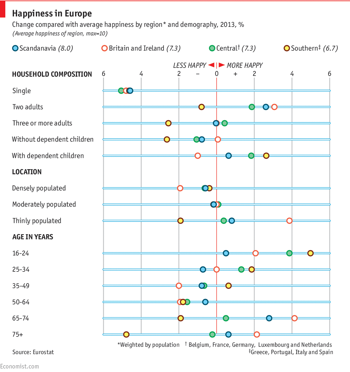 Σε μια πιο εξειδικευμένη ανάλυση, οι άνθρωποι της Μεσογείου προτιμούν να ζουν στις πόλεις, ενώ όσοι βρίσκονται πλησίον του Αρκτικού Κύκλου εμφανίζονται να προτιμούν την αγροτική ζωή. Επίσης, στη νότια Ευρώπη οι οικογένειες με παιδιά είναι πιο ευτυχισμένες, σε σχέση με εκείνες της Ιρλανδίας και της Μ. Βρετανίας. Κοινό στοιχείο σε όλους τους λαούς είναι ότι νιώθουν πιο ευτυχισμένοι όταν είναι νέοι και λιγότερο όταν βρίσκονται στη μέση ηλικία. Οι διαφοροποιήσει εμφανίζονται ξανά στην τρίτη ηλικία. Οι γηραιοί Βορειοευρωπαίοι ξαναβρίσκουν το κέφι του, σε αντίθεση με τους νότιους που ζουν κάτω από άθλιες συνθήκες – μια κατάσταση που είναι απότοκη της κρίσης χρέους και των οικονομικών προβλημάτων στις χώρες του νότου.