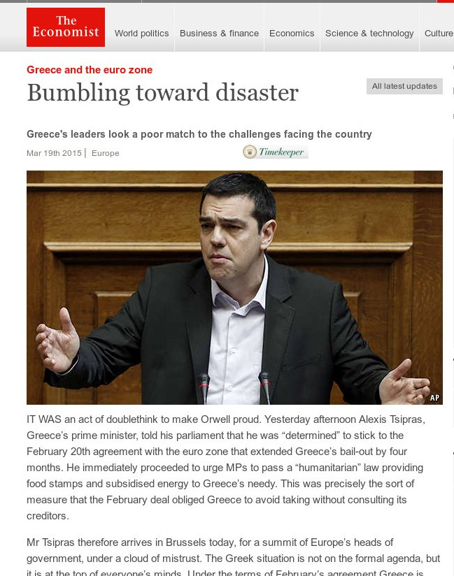 Κάτι δεν ταιριάζει σε αυτή την εξίσωση και ο Economist στο τελευταίο άρθρο του σημειώνει πως οι Έλληνες οδεύουν αδέξιοι προς την καταστροφή.