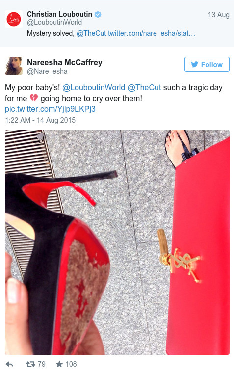 Λίγο αργότερα η ιδιοκτήτρια του παπουτσιού με την κόκκινη σόλα βρέθηκε. Πρόκειται για τη σχεδιάστρια υποδημάτων Ναρέσα μακ Κάφρι. «Σας άφησα ένα σουβενίρ. RIP στο Louboutin μου, που πέθανε στο Conde».