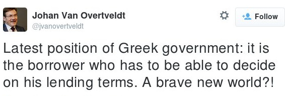 «Η τελευταία θέση της ελληνικής κυβέρνησης: Είναι ο δανειζόμενος ο οποίος θα πρέπει να έχει την δυνατότητα να αποφασίσει για τους όρους δανεισμού του. Ενας γενναίος, νέος κόσμος;!»