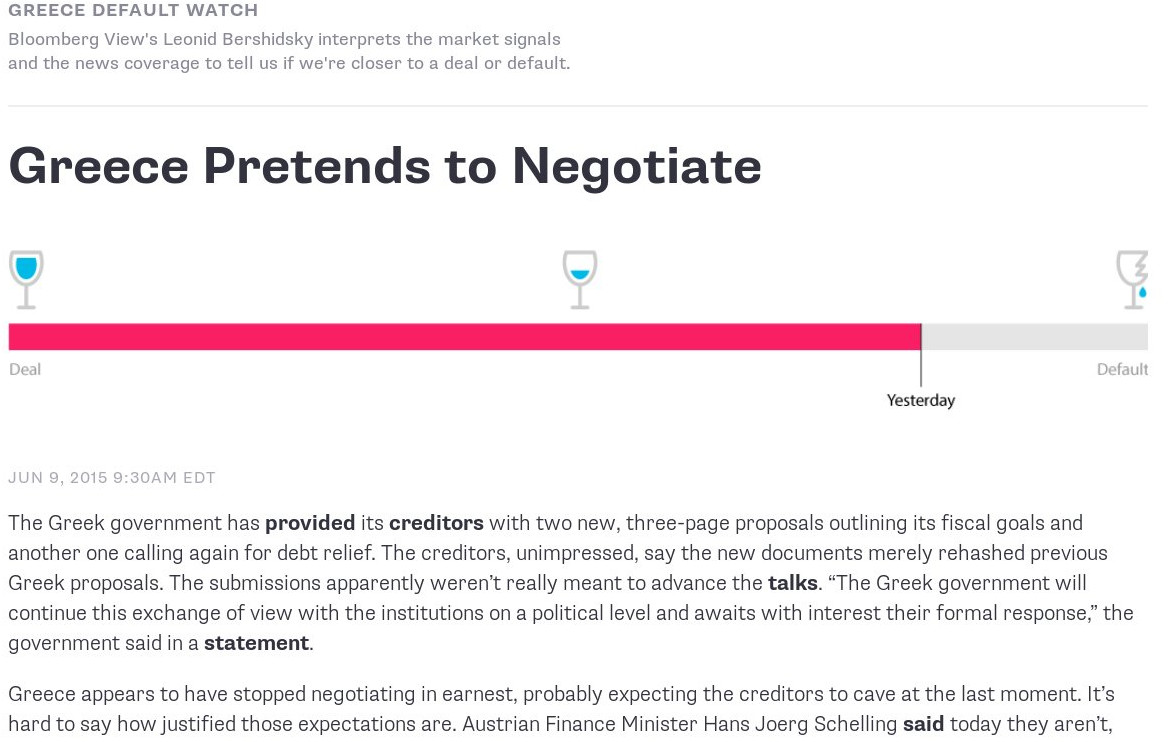 Το πρακτορείο Bloomberg έχει ανεβάσει ένα επίσης εξαιρετικά επικριτικό δημοσίευμα κατά της ελληνικής κυβέρνησης, σύμφωνα με το οποίο «Η Ελλάδα προσποιείται ότι διαπραγματεύεται».