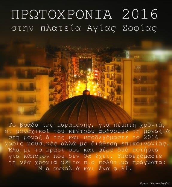 «Το βράδυ της παραμονής, για 5η Χρονιά, οι μοναχικοί του Κέντρου της πόλης, αφήνουμε τη μοναξιά στη μοναξιά της και υποδεχόμαστε το 2016 χωρίς φώτα, μουσικές και φαντασμαγορία, αλλά με αληθινή διάθεση επικοινωνίας.